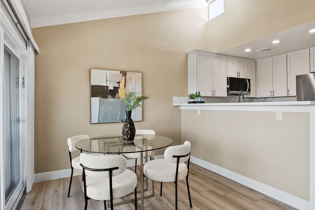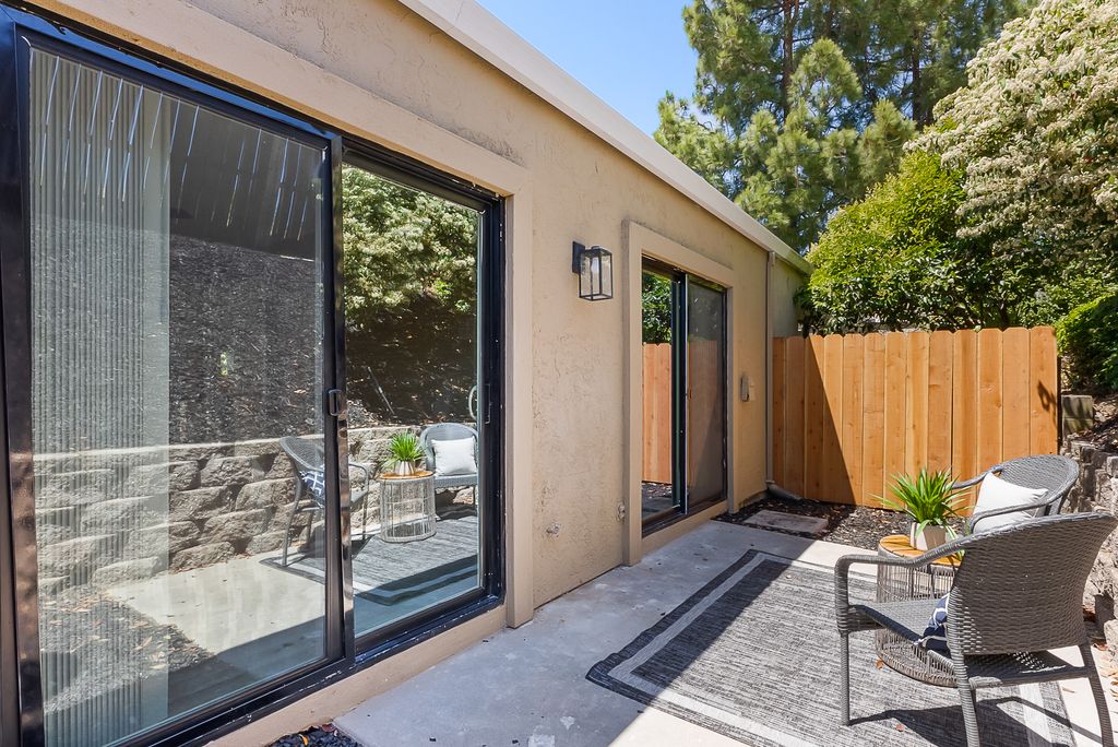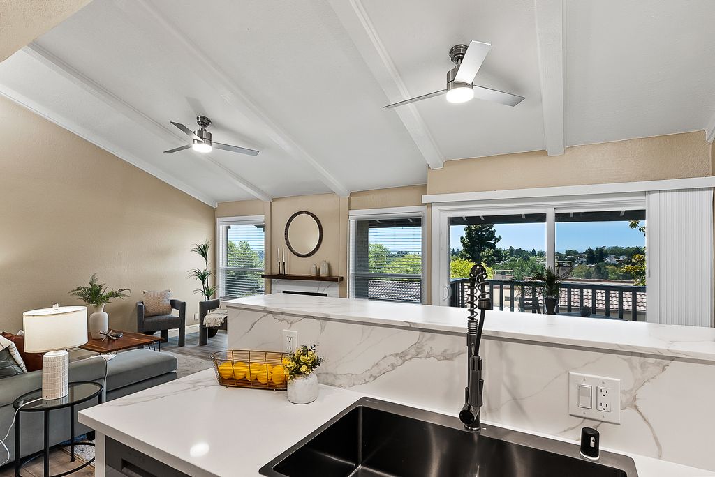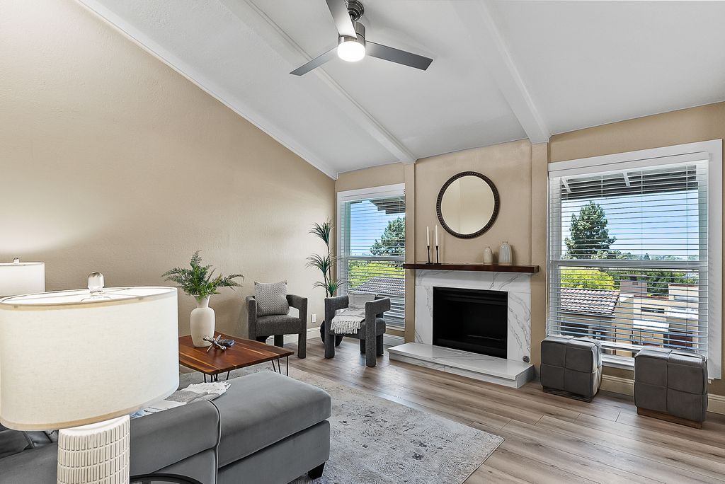 Welcome to this spacious and beautifully updated 2-bedroom, 2-bath townhouse tucked away in a quiet cul-de-sac, surrounded by mature trees and lush, park-like grounds that create a truly serene setting. The home features an open floor plan with vaulted ceilings, exposed beams, and abundant natural light. Enjoy modern upgrades including stainless steel appliances, new cabinets, and updated flooring throughout. Step out onto a private deck from the living room—perfect for relaxing or entertaining.