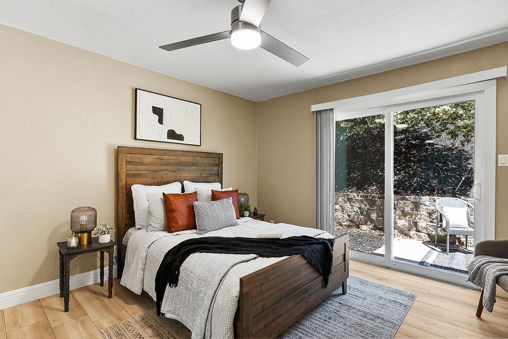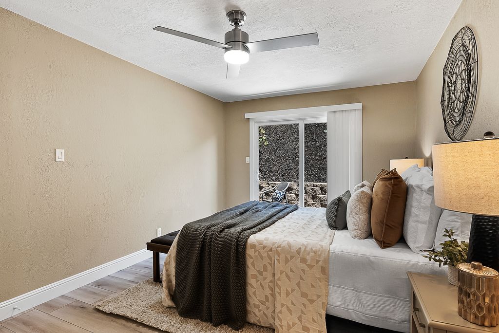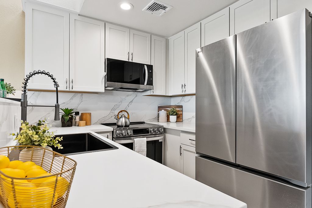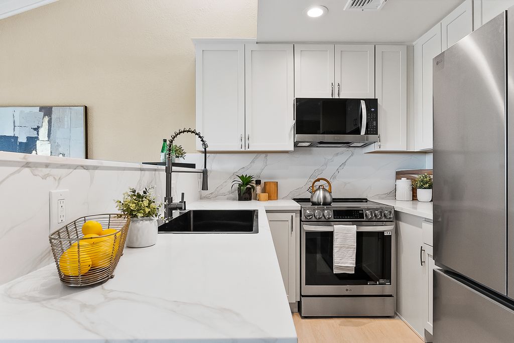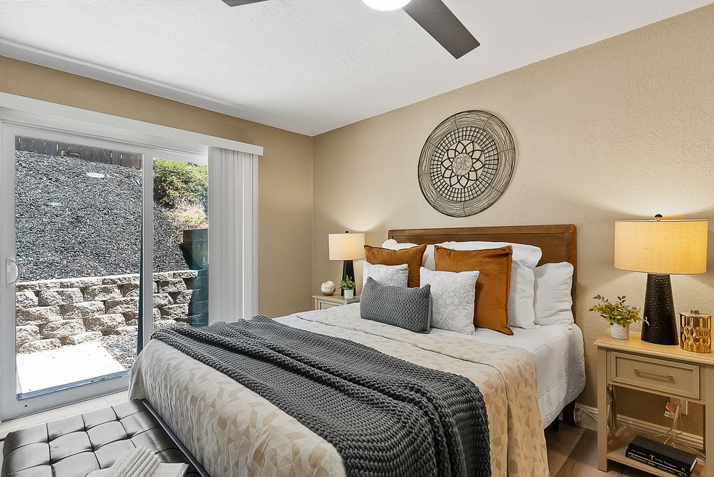 Welcome to this spacious and beautifully updated 2-bedroom, 2-bath townhouse tucked away in a quiet cul-de-sac, surrounded by mature trees and lush, park-like grounds that create a truly serene setting. The home features an open floor plan with vaulted ceilings, exposed beams, and abundant natural light. Enjoy modern upgrades including stainless steel appliances, new cabinets, and updated flooring throughout. Step out onto a private deck from the living room—perfect for relaxing or entertaining.